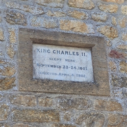 The plaque is on the outside wall of the much-altered and rebuilt buildings that once formed part of the Castle Inn in Broadwindsor. The plaque refers to an incident during Charles's escape after the battle of Worcester when the fugitive king and the small party accompanying him spent the night in the Inn. But no sooner had they gone upstairs than a detachment of parliamentarian soldiers turned up and also demanded accommodation, trapping the Royal party upstairs. Fortunately for Charles, one of the camp followers with the soldiers went into labour, causing a major row between the soldiers and the village authorities who were worried that the mother and child would be left in their care as paupers. In the event the distracted soldiers left the Inn without ever wondering who had been staying upstairs.