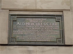 Here stood the house of Hercules Clay. Destroyed March 11th 1643 during the second siege of Newark by a bomb aimed at the Governor's Residence. The Alderman thrice dreamed of the destruction of his home, and consequently removed his family to a place of safety. As a thanksgiving he bequeathed a legacy in perpetuity to benefit his poorer townsmen.