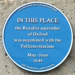 Oxfordshire Blue Plaques Board. In this place the Royalist surrender of Oxford was negotiated with the Parliamentarians May-June 1646. The Cromwell Association.