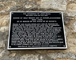 Fellow of new college, Oxford, 1600-1606. He organised the National relief campaign after the great fire of Dorchester in 1613; from 1620 he organised, raised the funds, and procured the charters for three companies which established the colony of Massachusetts. The settlers sailed in 1624-26 on ‘Fellowship’, ‘Amytic’ and ‘Pilgrime’; in 1627-8 on ‘Peeter’, ‘Happy Entrance’ and ‘Abigail’; and in 1629-30 on ‘Arbella’, ‘Lyon’s Whelp’ and ‘Mary and John’. From 1640-46 he also resided in London, where he was a leading member and chairman of the Assembly of Divines. In 1642 this house was plundered and his library stolen by a party of Prince Rupert’s Horse. From 1643 he was rector of St Mary’s, Lambeth where the Devil is said to have appeared in his bedroom. After a long wait White remarked “If thou hast nothing else to do, I have”, turned away and went to sleep.