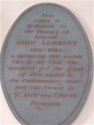 This tablet is dedicated to the Memory of general John Lambert 1619-1684 a native of this parish who in the Civil War laboured for the good of this nation in the Parliamentary cause and was buried in St Andrews Church Plymouth