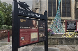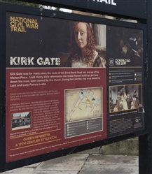 Kirk Gate was for many years the route of the Great North Road into and out of the Market Place. Until Henry VIII's reformation the timber framed buildings, part way down the road were owned by the church. During the Civil War they were owned by Lord and Lady Francis Leake.