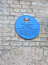Oliver Cromwell 1599-1658 MP for Cambridge, Lord Protector of the British Republic. At the Black Bear Inn, which stood on this site, Oliver Cromwell met with the Eastern Association to plan the Parliamentarian war effort in this region.