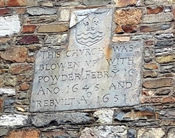 This chvrch was blowen vp with powder Febr.ey 1th Ano. 1645 and rebvilt A[n]o 1651