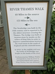 The sign/information board denotes part of the River Thames Walk. Waller attempted to cross the Thames at Newbridge on 27 May 1644 as part of his and the earl of Essex's attempt to encircle Oxford. The royalist news sheet Mercurius Aulicus indicated Waller was repulsed in this attempt by royalist dragoons (see Peter Young and Margaret Toynbee, Cropredy Bridge, 1644 (Kineton: Roundwood Press, 1970), p.34). However, Richard Coe in his account of Waller's campaign said that the parliamentarians used 'punts and some planks' to by-pass the royalist defences. (see British Library Thomason Tracts E.2[20], Richard Coe, An Exact Diarie or a breife Relation of the progresse of Sir William Waller’s Army, (London, 1644), p.3
