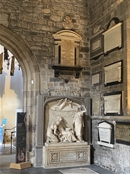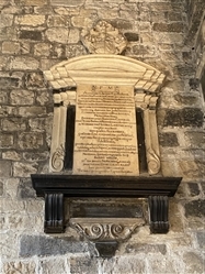 "P.M. Alexander Davison of the Golden Knight, and Anne, the daughter of Ralph Cocke, his beloved spouse, from whom he had five children: Thomas the Golden Knight, Radvlph Davison of Thornley; Samvel Davison of Wingate Grange, Joseph the Centurion of Hearts (in the defense of this town against the Scots Rebels I strove to the death Edward, a merchant deceased, married two daughters, first to Ralph Calverley, then to Thomas Riddell of Fenham in the county of Northumberland, and married Margaret to Henry Lambton , in the best cause of the King: always the most faithful royal, enduring with the greatest heart the grievous loss of the royal family, at last: in the siege of the town of this New Castle, fighting magnanimously with the rushing army of the Scots Rebels, he bravely poured forth his Newest Spirit (almost octogenarian), on the 11th Day of the Month of November, in the Year of his Incarnation In the 1843rd Lord, this monument was placed by Thomas, the first-born Knight, the Golden Knight.