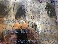D.O.M. Jordanus Crossland de Nube, miles, Constabularius de Scarborough, et custos ejusdem Castri, chiliarchus a Carolo primo et secundo, magna cum laude vixit, et pari cum gloria obiit 20 Augusti, an. a partu Virginis, 1670, ætatis me 53.