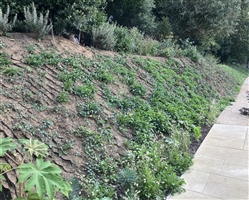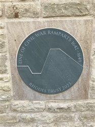 A simple design of a profile of a seventeenth century rampart and ditch with the inscribed wording identified above. The rampart is visible through the gate next to the plaque.