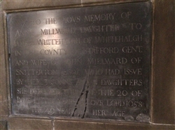 “To the pious memory of Anne Millward, daughter of James Whitehalgh, of Whitehalgh, in the county of Stafford, gent., and wife of John Millward, of Snitterton, Esq., who had issue by her, three sons and eight daughters. She departed this life the 20 of June, in the yeare of our Lord 1658, The 49 year of her age.”