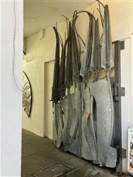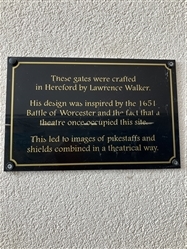 These gates were crafted in Hereford by Lawrence Walker. His design was inspired by the 1651 Battle of Worcester and the fact that a theatre once occupied this site. This led to images of pikestaffs and shields combined in a theatrical way.