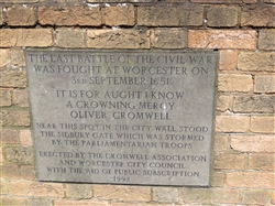 The last battle of the Civil War was fought at Worcester on 3rd September 1651 IT IS FOR AUGHT I KNOW A CROWNING MERCY OLIVER CROMWELL Near this spot in the city wall stood the Sidbury Gate, which was stormed by the Parliamentarian troops. Erected by the Cromwell Association and Worcester City Council with the aid of public subscription 1993