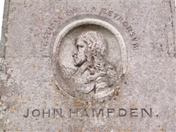 The profile medallion of John Hampden is heavily weathered and indistinct. Much of the inscription is hard to read because of weathering