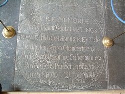 Sacrae Memoriae Inclurissimi ducis Hastings Keyt Filli johannis Keyt de Eberington agro Gloucestriensi Armiger wigorniae cohornum ex parte regis praefecti in praetio juxta Stow 21 die Martii 1645 occisi