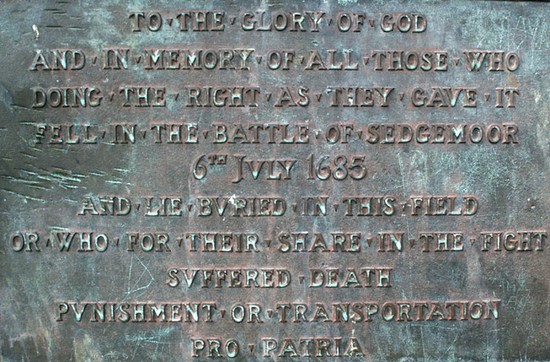 ‘TO THE GLORY OF GOD AND IN THE MEMORY OF ALL THOSE WHO DOING THE RIGHT AS THEY GAVE IT FELL IN THE BATTLE OF SEDGEMOOR 6 JULY 1685 AND LIE BURIED IN THIS FIELD OR WHO FOR THEIR SHARE IN THE FIGHT SUFFERED DEATH, PUNISHMENT OR TRANSPORTATION. PRO PATRIA’