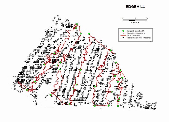 The objective of consistent coverage is further enhanced by the use of Global Positioning System (GPS) units. The chosen GPS unit is the Garmin Etrex Venture. Each detectorist carries a GPS unit set to record their location every 15 seconds during the survey. The units hold over 2000 of these ‘trackpoints’, enabling a whole day’s survey to be logged. At the beginning and end of each transect the detectorist also records a waypoint to confirm the transect length detected. When downloaded into a Geographical Information System (MapInfo GIS) this data enables the actual spatial coverage and timing to be accurately mapped. This provides information on exactly how much time was spent prospecting as opposed to digging, as well as time not detecting. It is intended that this provides an effective method to compare surveys on different battlefields. In addition, at the start of the day a ‘static’ GPS unit is placed at a known point marked on the Ordnance Survey mapping. The track log of this static GPS provides a 15 second interval record showing the drift in GPS location and should be useable to enable reprocessing of the data from each detectorist’s GPS to provide a limited correction for the drift.