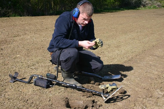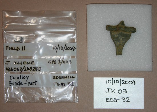 Each find, apart from obviously modern ‘junk’, is separately bagged when found. The GPS is then used to record a ‘waypoint’. The GPS unit stores the latitude/longitude (for conversion to 12 figure grid reference) for each waypoint. The finds bag is then annotated with the detectorist’s initials and the waypoint number so that it can later be correlated with the GPS data downloaded into the GIS. When the work on that field for that day is completed then all the finds bags from that field from that day are placed together in a single large bag and dated. Brief notes are also made as to the land use, soil conditions etc of the field, weather and other information relevant for the understanding of the effectiveness of the detecting on that field on that day. The metal detector used by each detectorist is also recorded. Also a note is made of the number of non ferrous ‘junk’ collected be each person, as a guide to the degree of confusing background material and as a general guide to recovery rates