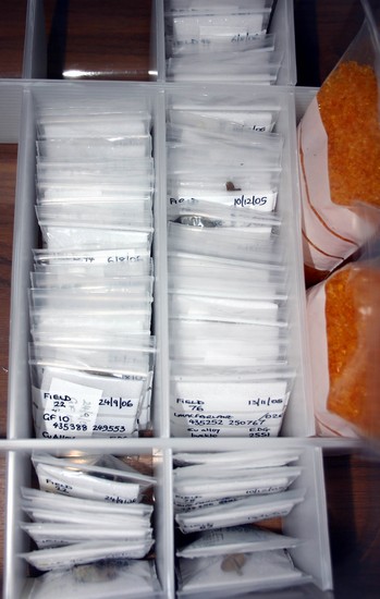 Re-bag every find re-sealable plastic bag (normally 60mm * 60mm but larger as necessary) with white, write on strips. Package find with 50mm * 50mm * 3mm (or larger as appropriate) piece of Plastozote foam as protection from abrasion.