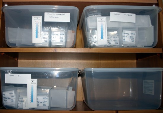 All finds to be stored in 13 litre polypropylene airtight boxes (Stewart boxes, product ID: 1781008), separate boxes for: coins, copper alloy, ferrous, lead, lead bullets. Finds bags are stored standing upright in Find Number order within the appropriate box. To facilitate this the boxes are divided into compartments using 4mm thick corrugated plastic, with a second level of finds in a subdivided tray stapled together from corrugated plastic. To maintain low humidity each box to contain 1kg Orange Indicating silica gel in re-sealable bags perforated with numerous small holes. Inside to the front of each box a Humidity Indicator strip faces outward to enable regular (at least weekly) monitoring of humidity levels.
