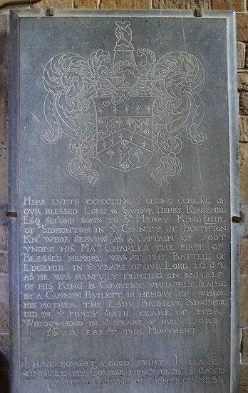 In Radway church there are two monuments to Captain Kingsmill, who died on the battlefield at Edgehill. One is a typical monumental slab, but it is also accompanied by an effigy. A mid 18th century map exists in the Record Office at Warwick which marks the exact location on the battlefield where he was struck down by a cannon ball. These two monuments were removed here when the medieval church in Radway was demolished and the present church built here, on a new site, in the 19th century.