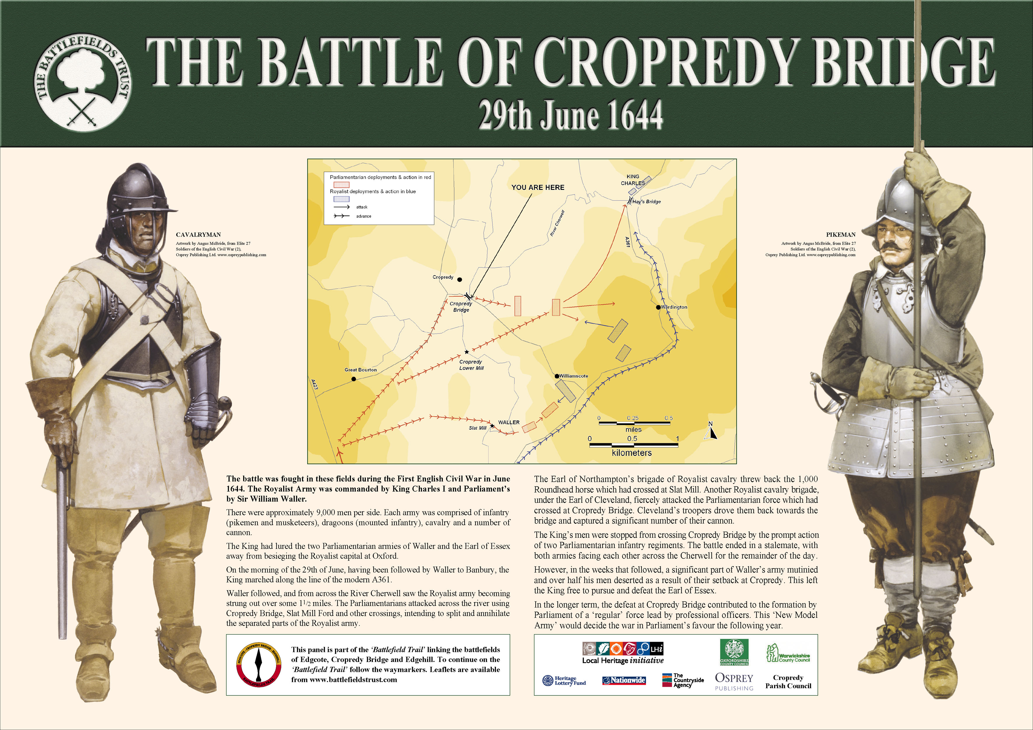 On 26th June 2005 the Battlefields Trust unveiled its interpretation panel beside the bridge at Cropredy. This was the first of a series of panels on the long distance trail that the Trust is developing to link the battlefields of Edgcote, Cropredy and Edgehill. The trail runs from Chipping Warden in Northamptonshire to Kineton in Warwickshire and was completed in autumn 2006.