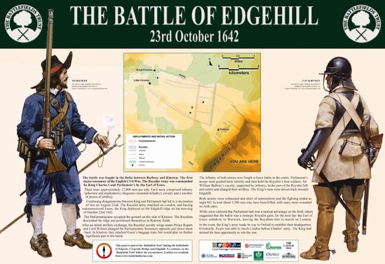 This new panel is one of a series being erected by the Battlefields Trust in 2005-2006 at Edgcote (1469), Cropredy (1644) and Edgehill, along a new long distance waymarked trail the Trust is marking to link the three battlefields. This Edgcote to Edgehill Trail project has been grant aided by the Local Heritage Initiative. The Trust would also like to thank the Hook Norton Brewery and the landlord of The Castle Inn for their support for this Edgehill panel.