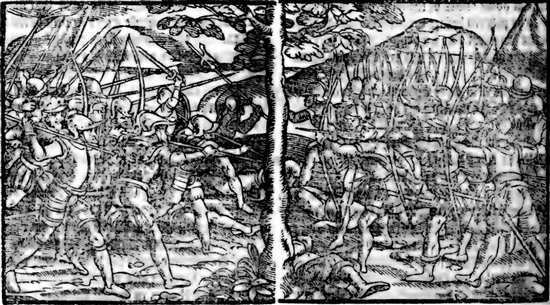 On the morning of 28 July, Lord Russell led his army from Honiton to confront the rebels gathered three miles away at Fenny Bridges, hoping to drive them back and clear the way to Exeter. In preparation for the inevitable attack, the insurgents had left a detachment at the bridge itself to defend the crossing, while the mainstay of their army was arrayed in a meadow a short distance away. Russell’s initial attempt to seize the bridge, probably by dismounted horsemen, was repulsed by the archery of the rebels’ guard force, which caused several casualties including Sir Gawen Carew, struck by an arrow in the arm, and the insurgents only withdrew when flanking cavalry units forded the shallow waters.