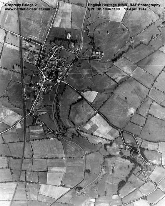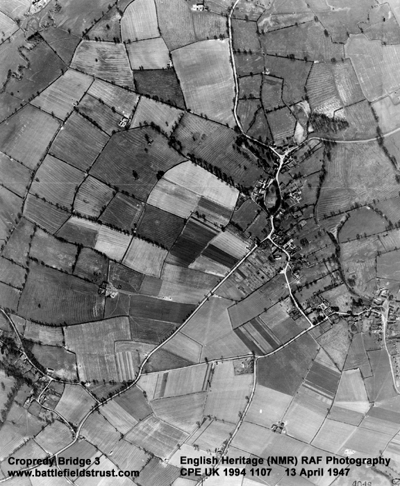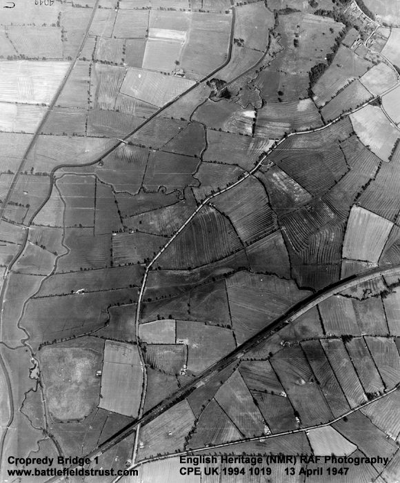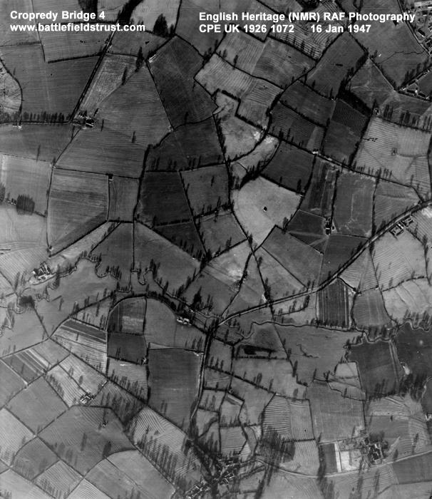 The battle extended over several miles, involving several crossings of the river and extending across to the Northamptonshire border at Hay's Bridge, near Chipping Warden. Apart from limited expansion of the villages of Cropredy, Williamscot and Wardington and various isolated farms the area remains almost wholly undeveloped. Communications routes, in the form of a canal and railway, are the only significant intrusions into an otherwise agricultural landscape. The width of the river has almost certainly been reduced through modern drainage and deepening, but the greatest transformation has been the enclosure in the 18th century of the open fields of Wardington, across which much of the action was fought.