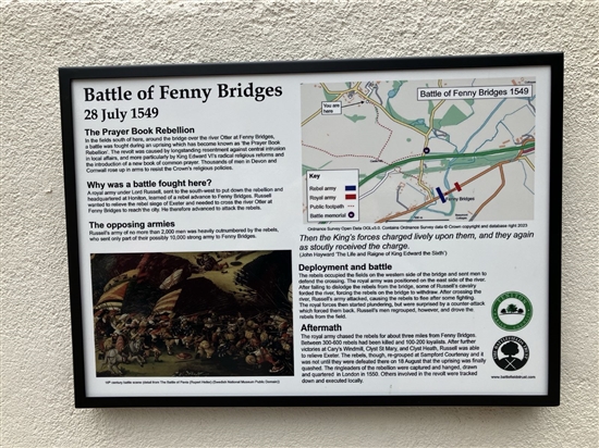 A monument to the battle is located a short distance north of the A30 along the eastern side of the minor road running between Fenny Bridges and Feniton. This commemorates the battle at the traditional site. An information board explaining the battle was installed by the Parish Council and Battlefields Trust in the car park at Feniton Village Hall (EX14 3BB) in July 2024.