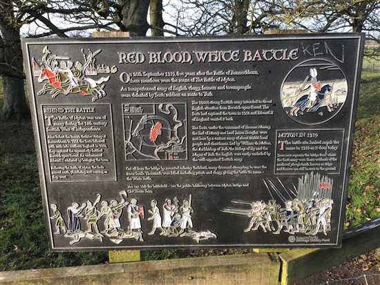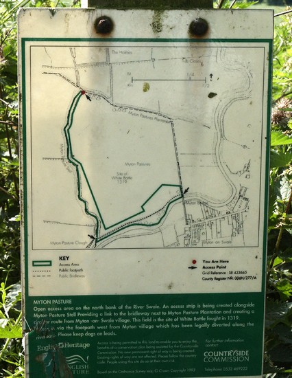 This is now a secluded landscape with a feeling of remoteness that makes a very pleasant battlefield walk, though the uncertainties about the exact location of the action are a problem. There is good pedestrian access to the battlefield via public rights of way and the Countryside Stewardship scheme. Please note that parking is now in the village of Myton on the grass verge near the church.  An information board about the battle has been installed at the Myton village entrance to Myton Pastures near the bridge.