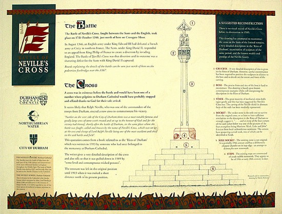 The battle of Neville's Cross, between Scottish and English forces, took place on 17th October 1346, on moorland just to the west of Durham. The two armies clashed on the narrow ridge close to Neville's Cross. The English had already chosen the best ground before the Scots could assemble their army and so the invaders found themselves severely disadvantaged by the terrain. Despite the battle being evenly balanced for a time, the Scots were out manoeuvred and gradually fled the field, all but abandoning their King.
