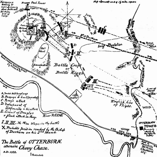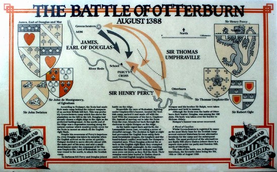 On the 5th or 19th August - the chroniclers differ in their dating - the Scots were camped about a mile to the west of Otterburn after attempting unsuccessfully to take the castle. Following a council of war Douglas decided, against the wishes of many who counselled a continued swift withdrawal, to remain at Otterburn; possibly to await his enemy an offer him the chance of chivalric redress, or possibly to make a further attempt on the castle the following day. The arrival of Percy’s forces in the early evening took them by surprise.