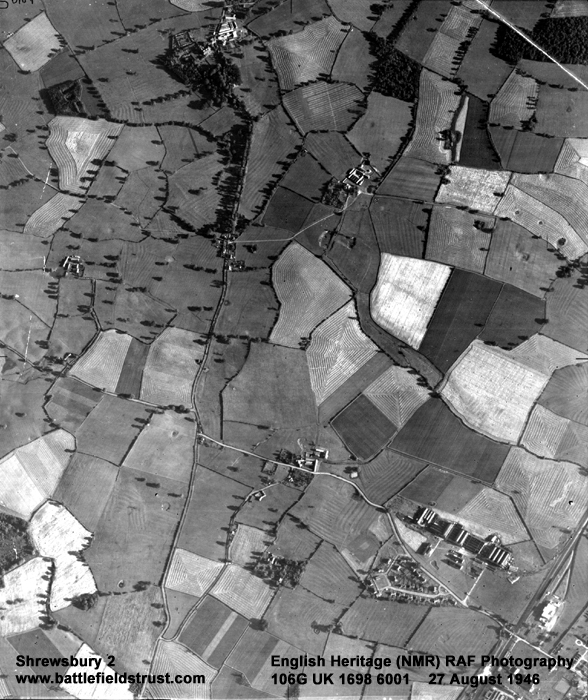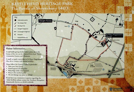 The battlefield remains almost wholly undeveloped agricultural land, though now fully enclosed as hedged fields. The Shrewsbury by-pass (A5124) crosses the very southern edge of the battlefield, from east to west, along the probable line of Henry’s deployment. Battlefield Church, which was built within a few years of the battle at the behest of King Henry ‘for the souls of those who fell’, is believed to sit close to the centre of the action. Access is via metalled and fenced public footpaths laid out by the local authority in a circular route around the battlefield, and including the church. A viewing mound and car park to the south has also been provided. In 2008 ‘Battlefield 1403’, an exhibition centre on the battle together with a café and farm shop was opened in converted farm buildings just north of the registered battlefield and a new permissive path leads from the centre down to the battlefield itself.