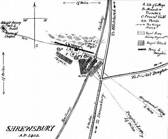 The Percy rebellion crushed and Hotspur killed by a royal army on the rising ground close to the Whitchurch road north of Shrewsbury.