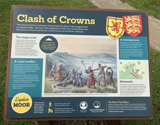 In October 2022, an impressive memorial stone and interpretation board were unveiled to mark the 700th anniversary of the battle. The erection of this fitting monument was a joint venture involving the North York Moors National Park, the Battlefields Trust, and the North Yorkshire Moors Association.