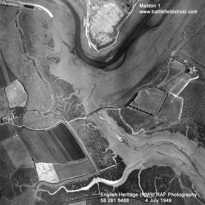 Location: probably located on the mainland directly opposite Northey island, though other sites have been suggested. terrain likely to have been estuary & open pasture land?