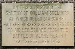 On this site stood the smithy of William Skelhorn at which Queen Margaret had her horses shoes reversed to aid her escape from the battle of Blore Heath 23rd September 1459