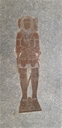 Only the upper half of the brass is original. The legs , which are of a slightly larger scale than the body, were added approximately a century ago. The brass originally stood on an altar tomb on the south side of the chancel before being relaid on the chancel floor in the mid-18th century.