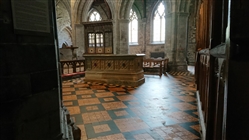 The Purbeck marble chest is in good condition but the brass was removed in the 17th century and what is there now is a late 19th century replacement