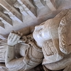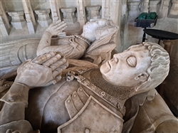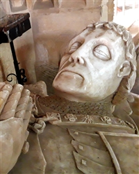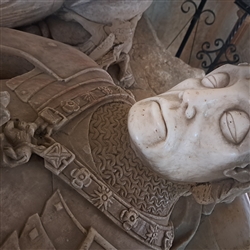 The effigy used to be described as that of Sir Thomas Wykeham (d1443) and indeed some picture libraries call it that but it's clear from both the armour and the Yorkist livery collar that this is a much later effigy in a different style to that of Elizabeth. The effigy may have been moved to its current location during a restoration in 1846 to replace that of Sir Thomas; an early 19th cent account talks about a badly damaged effigy on the floor. The face does not appear to have been recut and seems to be an integral part of the whole . Interestingly both the armour and the face (which is clearly an 'ikon' ie a made-up image) are remarkably similar to two other effigies - Sir William Ryther (of Ryther in Yorks) and Sir Nicholas Fitzherbert (of Norbury, Derbyshire).