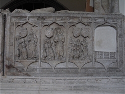 (Lower edge) Hic jacent Johanna Howell et Isabella Butler, uxores dictae Thomae, quae Johanne obiit xxj die Sept' ao' di' mcccclj et dca' Isabl' obiit ---die --- ao' di' m---