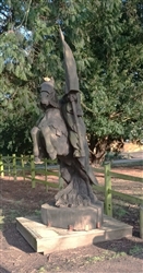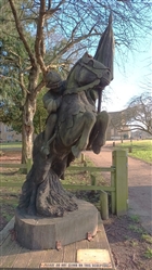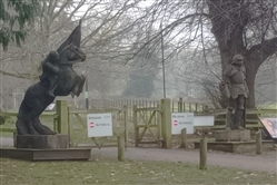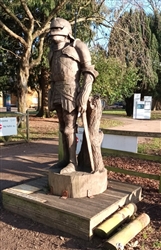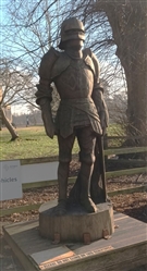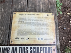 The life sized statues were carved in 2015 by Simon O'Rourke, having been commissioned by the now abolished Northampton Borough Council as part of a six statue "Knights Trail" for the town centre. These were subsequently relocated to other locations around the town. The full trail covers the development of armour from 1215 to 1460. The two statues at Delapre Abbey depict a man at arms on foot and a mounted knight from the Wars of the Roses. Both are dressed in the most up to date armour that would have been worn at the 1460 battle. The information plaques on the bases about the battle have been superseded by more recent research.