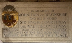 John Courtenay, 16th Earl of Devon. He was commander of the left wing of the Lancastrian army and died in the fighting on the battlefield. The memorial is faded and had since its erection been enclosed in a small cupboard in the chapel. It is not visible to the public
